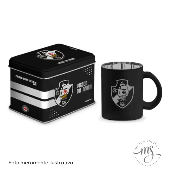 Tema "Time Vasco": O design é totalmente dedicado ao Club de Regatas Vasco da Gama. A caneca exibe o escudo oficial do Vasco em destaque, as cores tradicionais do clube (preto e branco) e, possivelmente, outros elementos gráficos que remetem à Cruz de Malta e à história do Vascão. A estampa é aplicada de forma nítida e resistente sobre o acabamento metálico.