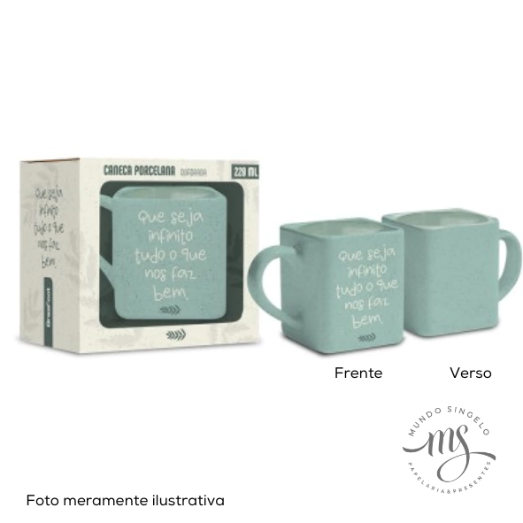 Esta caneca quadrada da Brasfoot é um item de design diferenciado que carrega uma mensagem de desejo de continuidade e eternidade para as coisas boas da vida.