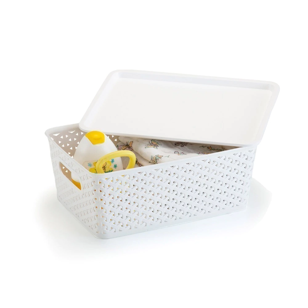 A caixa organizadora tem sua composição injetado em material plástico e sua textura lembra as tramas do Rattan. O seu design com tampa e alça para carregar faz com que permita a circulação do ar, assegurando que os itens ali acondicionados fiquem livre de bolor e outros inconvenientes. Material resistente e ideal para organização.