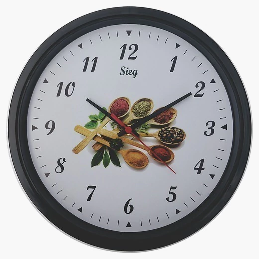 Relógio redondo preto especiarias em aro plástico com design moderno, ideal para decorar e harmonizar o seu ambiente.