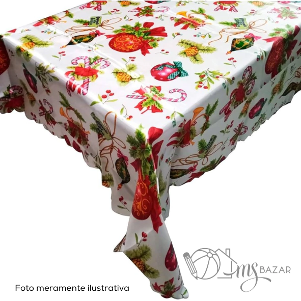 Com dimensões de 150x150 centímetros, esta toalha é projetada com um tema natalino, apresentando elementos como árvores de Natal, renas, presentes e outros símbolos tradicionais.