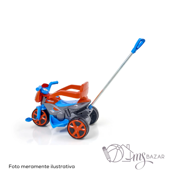 Design e Funcionalidade: O grande diferencial é a barra de empurrar. A barra permite que os pais ou os cuidadores controlem o movimento do triciclo, o que torna o passeio mais seguro e confortável para a criança. O design que remete a uma moto de corrida, com as cores azul e vermelho, o torna ainda mais atraente.